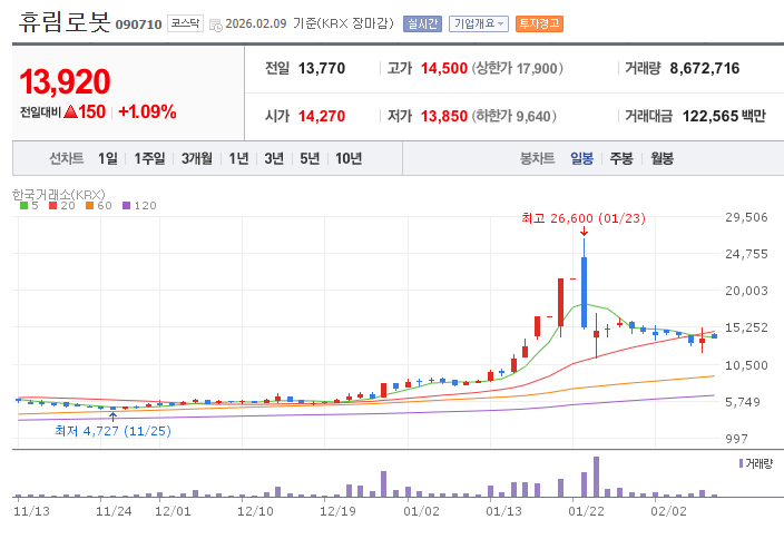 2026년 2월 기준, 휴림로봇의 주가는 13,000원~14,000원 선에서 등락을 거듭하고 있습니다.