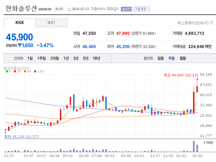 - 기술적 분석: 2026년 2월 중순 기준, 주가는 46,000원~48,000원 사이에서 강력한 상승 흐름을 보이고 있습니다. 67%에 달하는 최근 한 달간의 급등은 단순 반등이 아닌 추세 전환의 신호입니다.